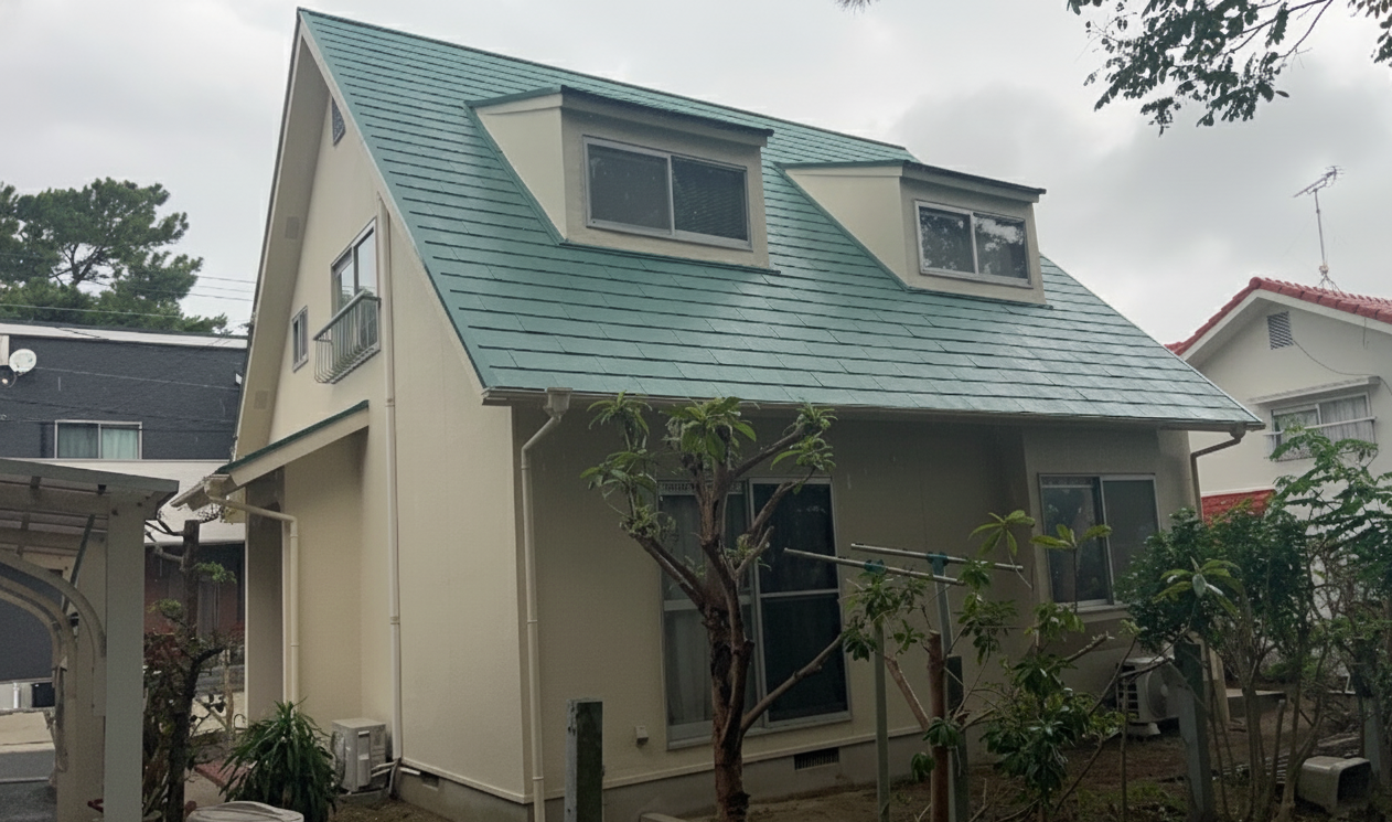 暗く色褪せていた屋根は、鮮やかな緑青色に。洋風デザインの可愛らしさが引き立ち、家全体が明るい表情になりました。外壁は清潔感のあるオフホワイト(クリーム色)で塗り替え。この白が屋根の鮮やかな色をしっかり引き立て、美しいコントラストを生んでいます。