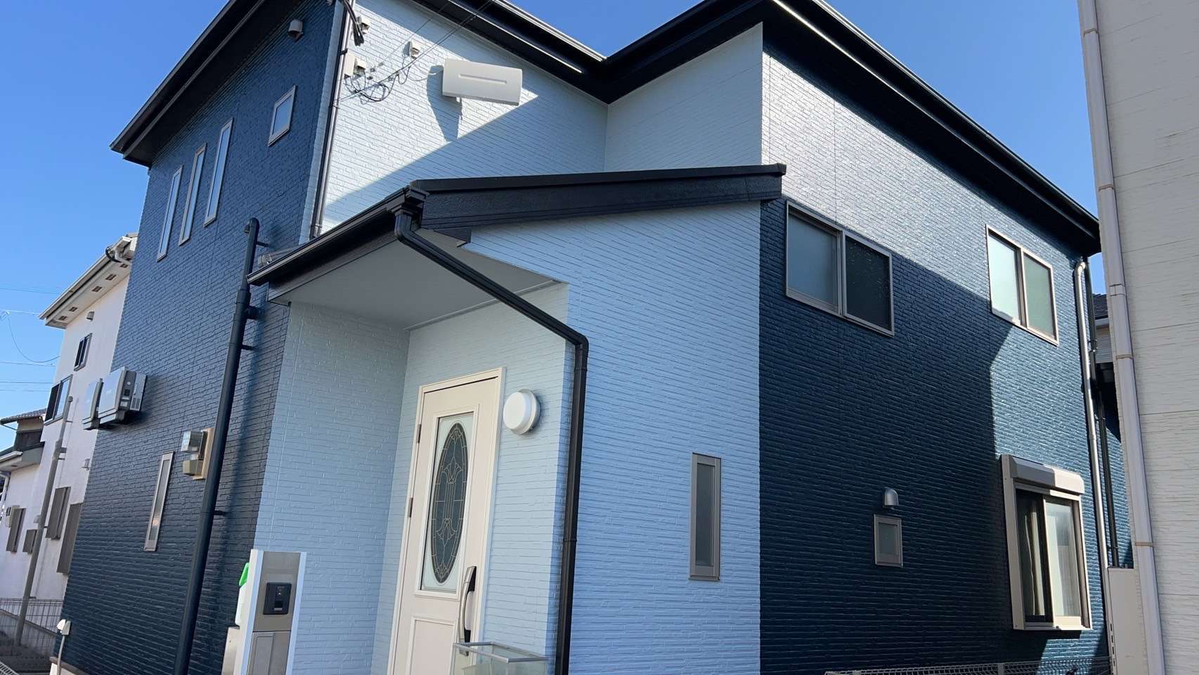 その結果、玄関廻りを青み掛った薄いグレー、その他の部分をネイビーを採用し統一感のあるツートンカラーで決定しました。